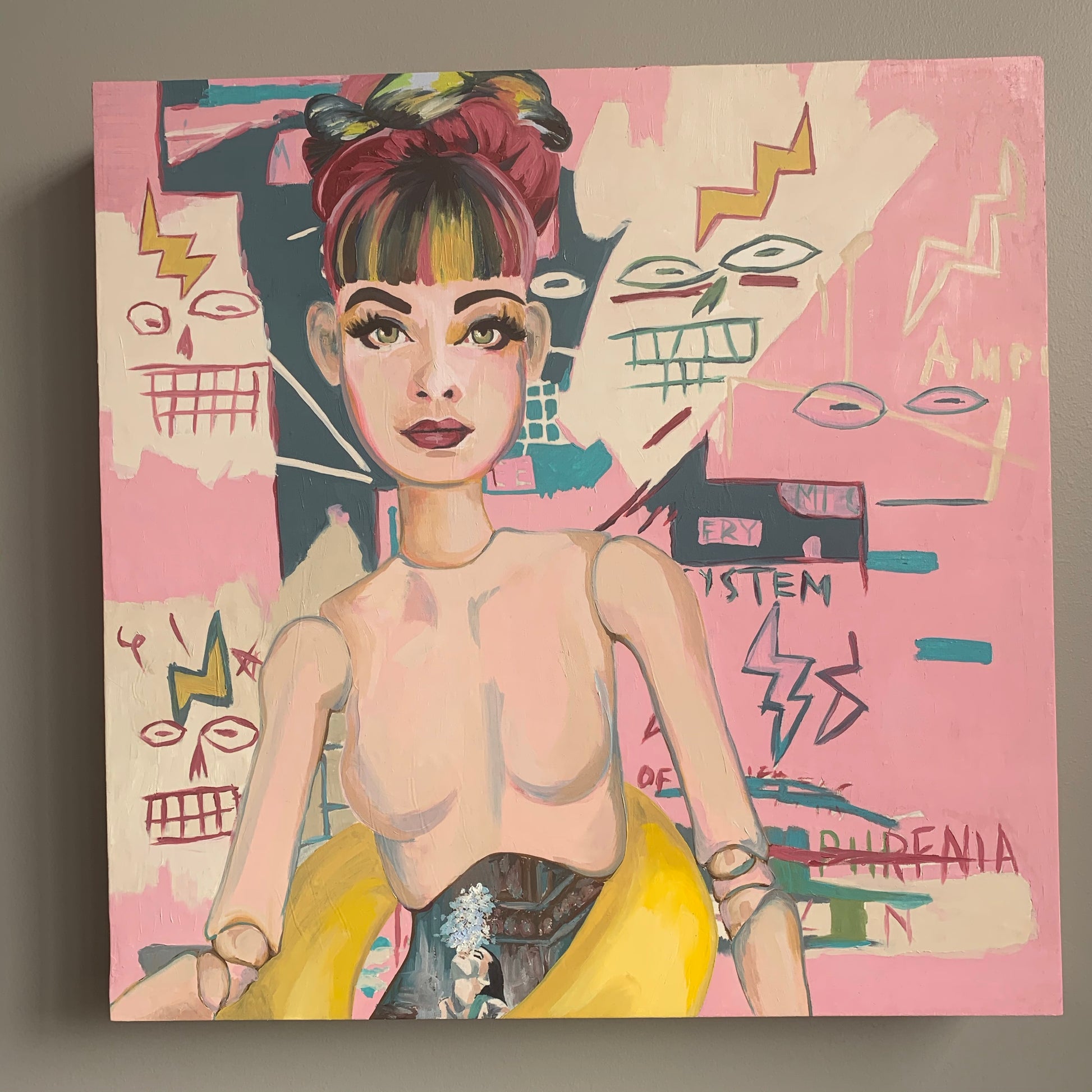 Vibrant Vessel of Vulnerability showcases a mesmerizing blend of whimsy and emotion. Measuring 24"x24" and rendered in rich oil, this piece captures a colorful, stylized portrait of a doll-like female figure. Her exaggerated facial features—large, round eyes and prominent lips—draw you into a world where playfulness meets depth. The intricate bun of her multicolored hair and her striking outfit, complete with a detailed corset-like element, enhance her captivating presence.