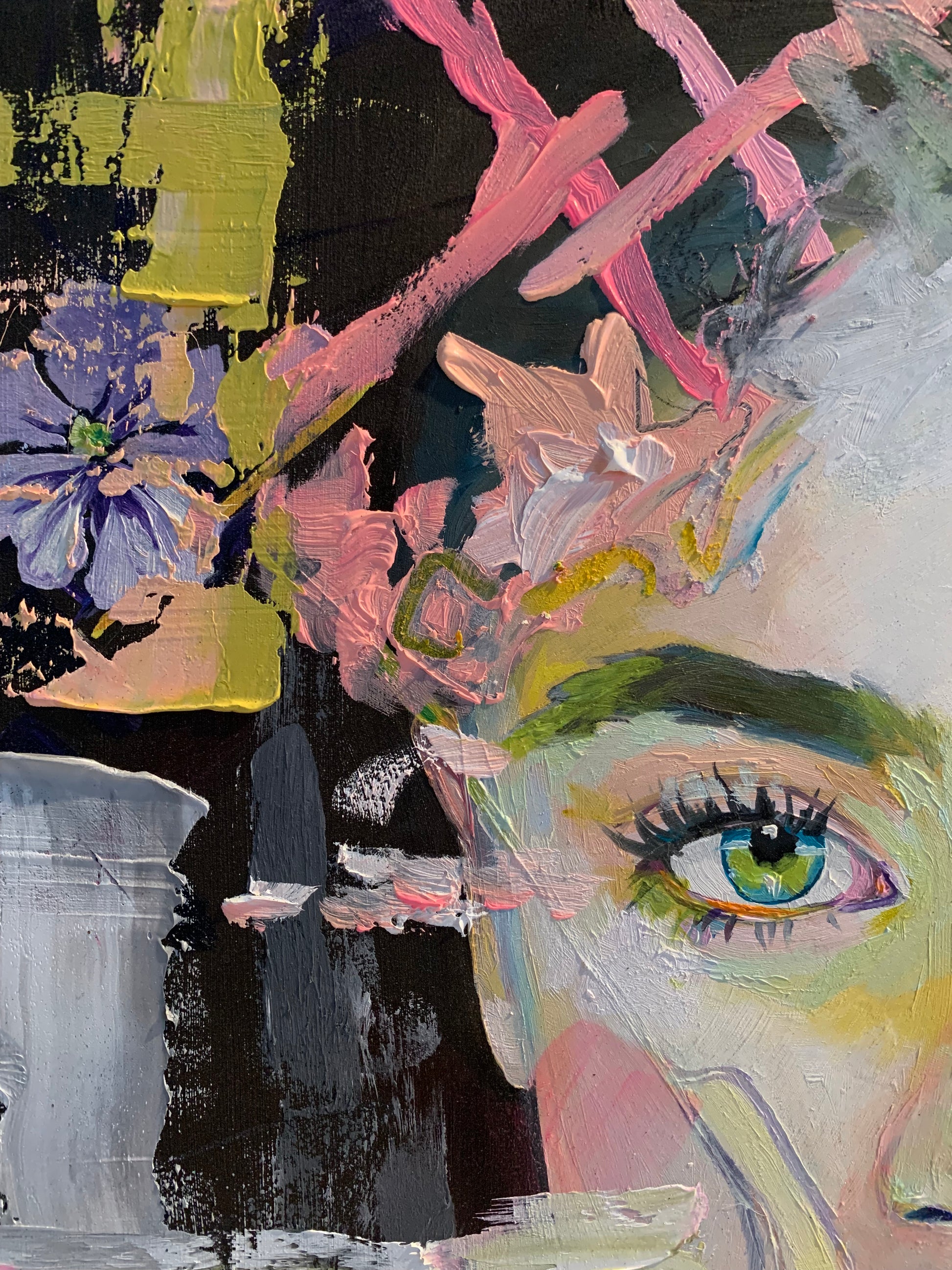 Her gaze cuts through layers of abstraction and color — part dream, part revelation. Each brushstroke moves between chaos and calm, reminding us that transformation rarely feels tidy. The energy of Fearless Inertia captures that in-between moment — where hesitation meets courage and something inside finally says “yes.”