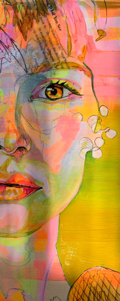 Fluorescent color and delicate linework merge to create a feeling of emergence — part dream, part awakening. Layers of handwritten marks, petals, and fragments of thought trace the path from invisibility to clarity.