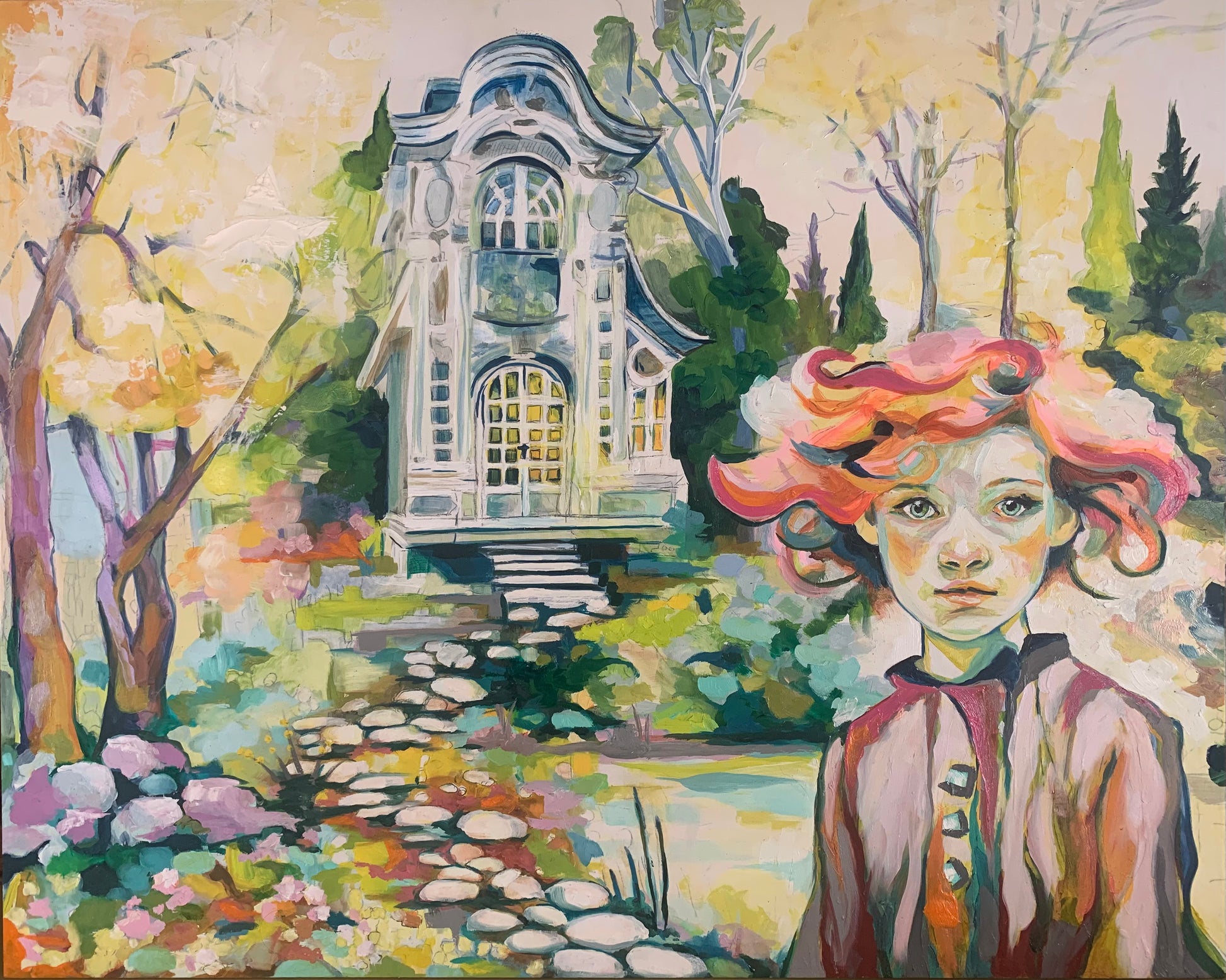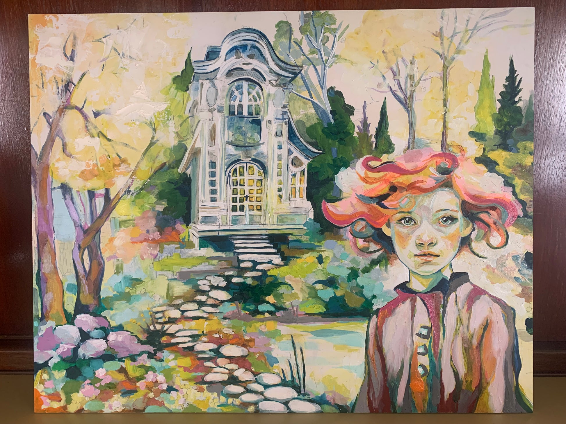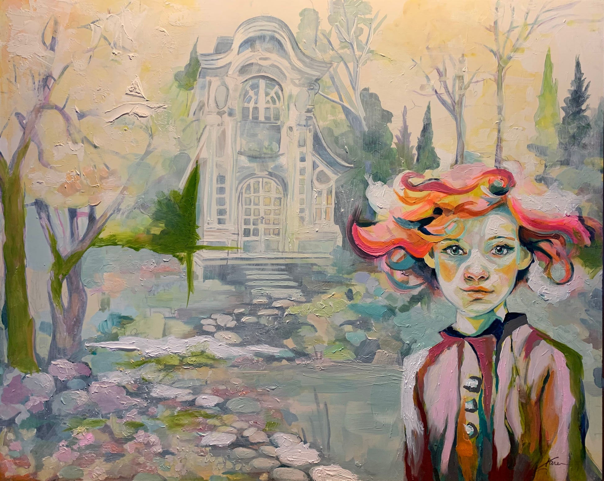 This captivating oil painting invites you into a world where the past and present blend seamlessly. A young figure, with vibrant pink hair that seems to dance in the breeze, gazes out with an expression that holds both curiosity and a hint of melancholy. Behind them, an ornate, timeworn building stands amidst a garden filled with vibrant, surreal colors, as if the landscape itself is alive with memories. The pathway leading to the door invites the viewer to step into this dreamlike realm, where every detail tells a story of forgotten moments and timeless beauty. This piece captures the delicate balance between nostalgia and the enchanting mysteries that lie just beyond the threshold.