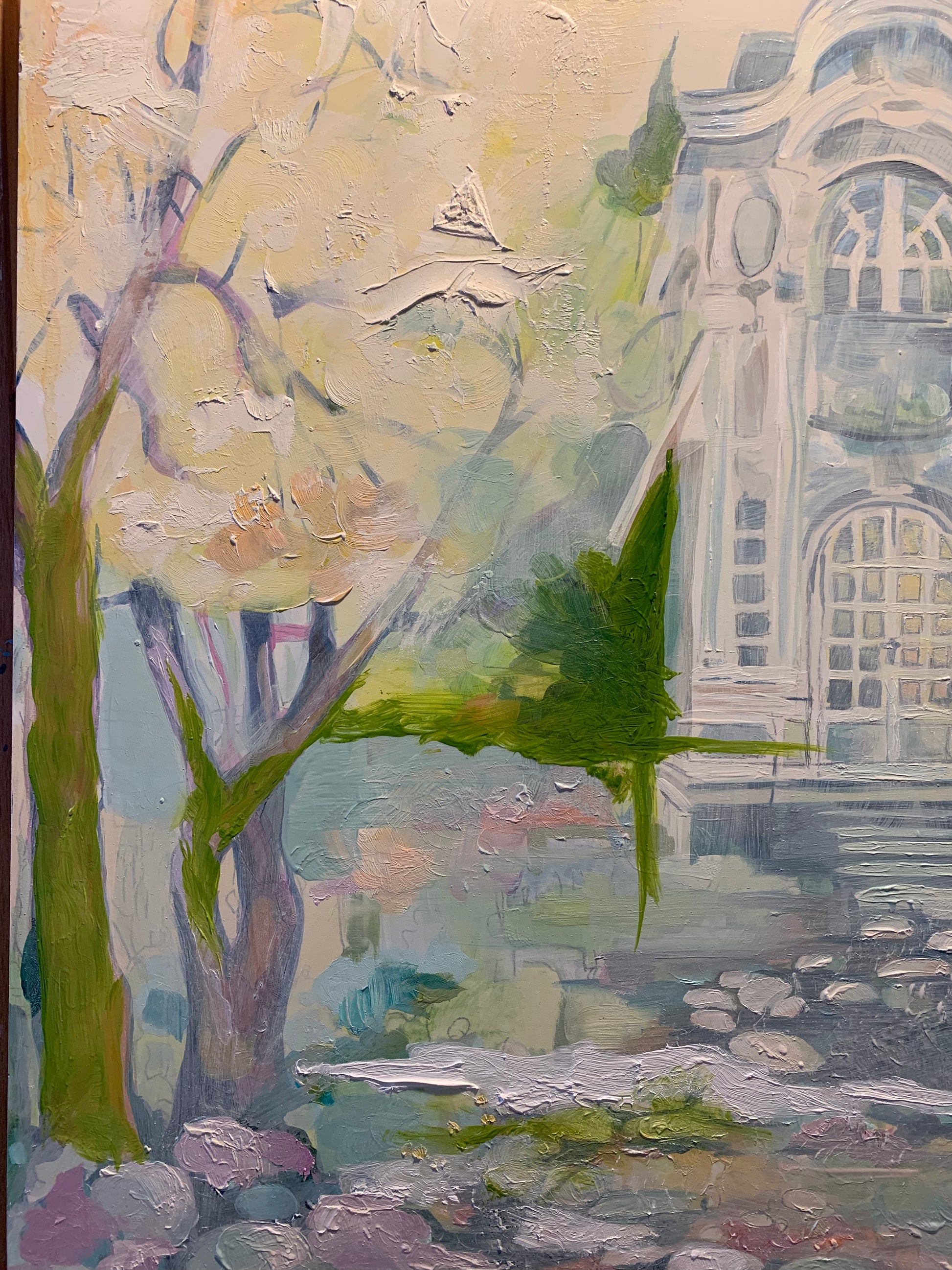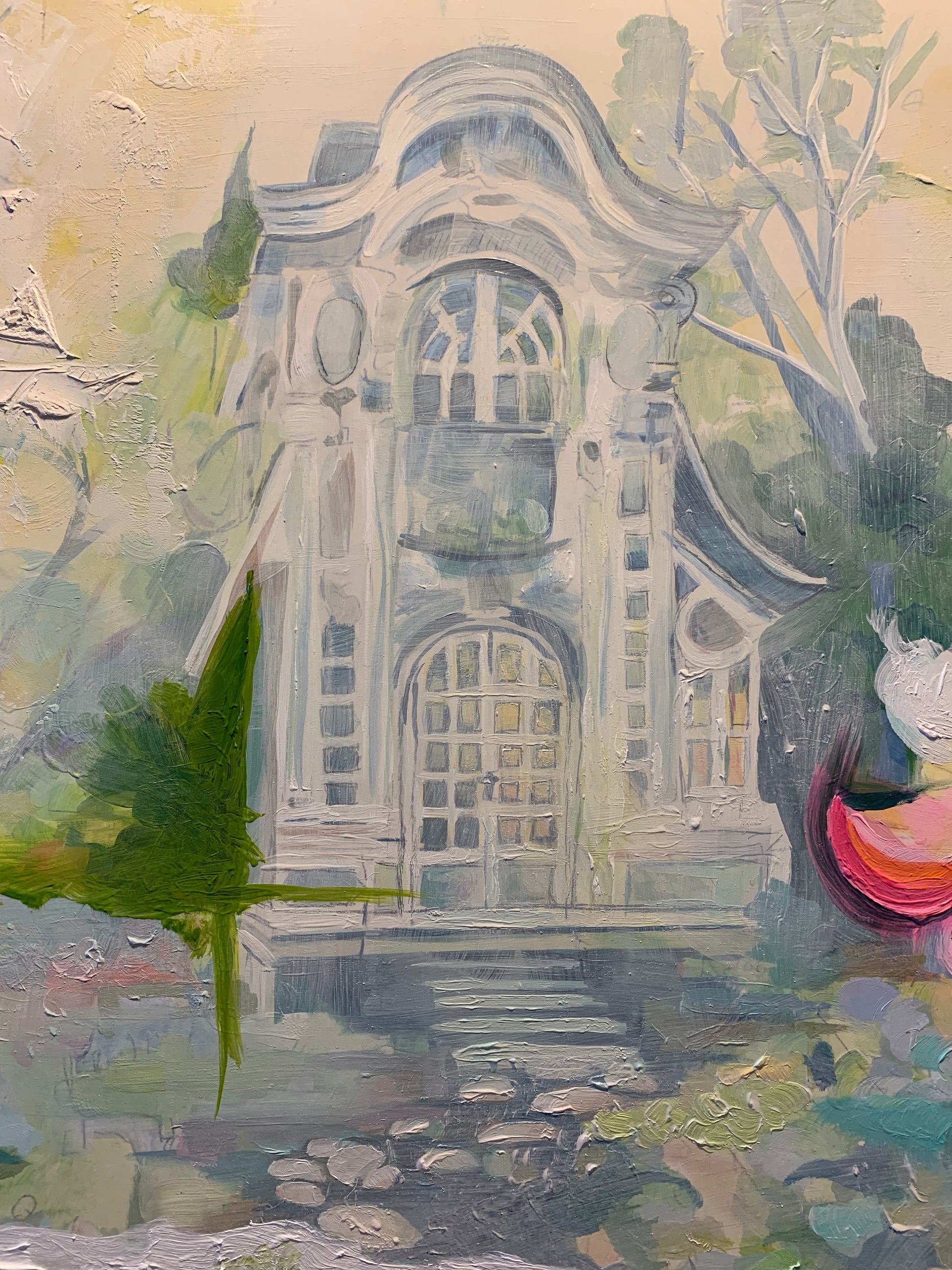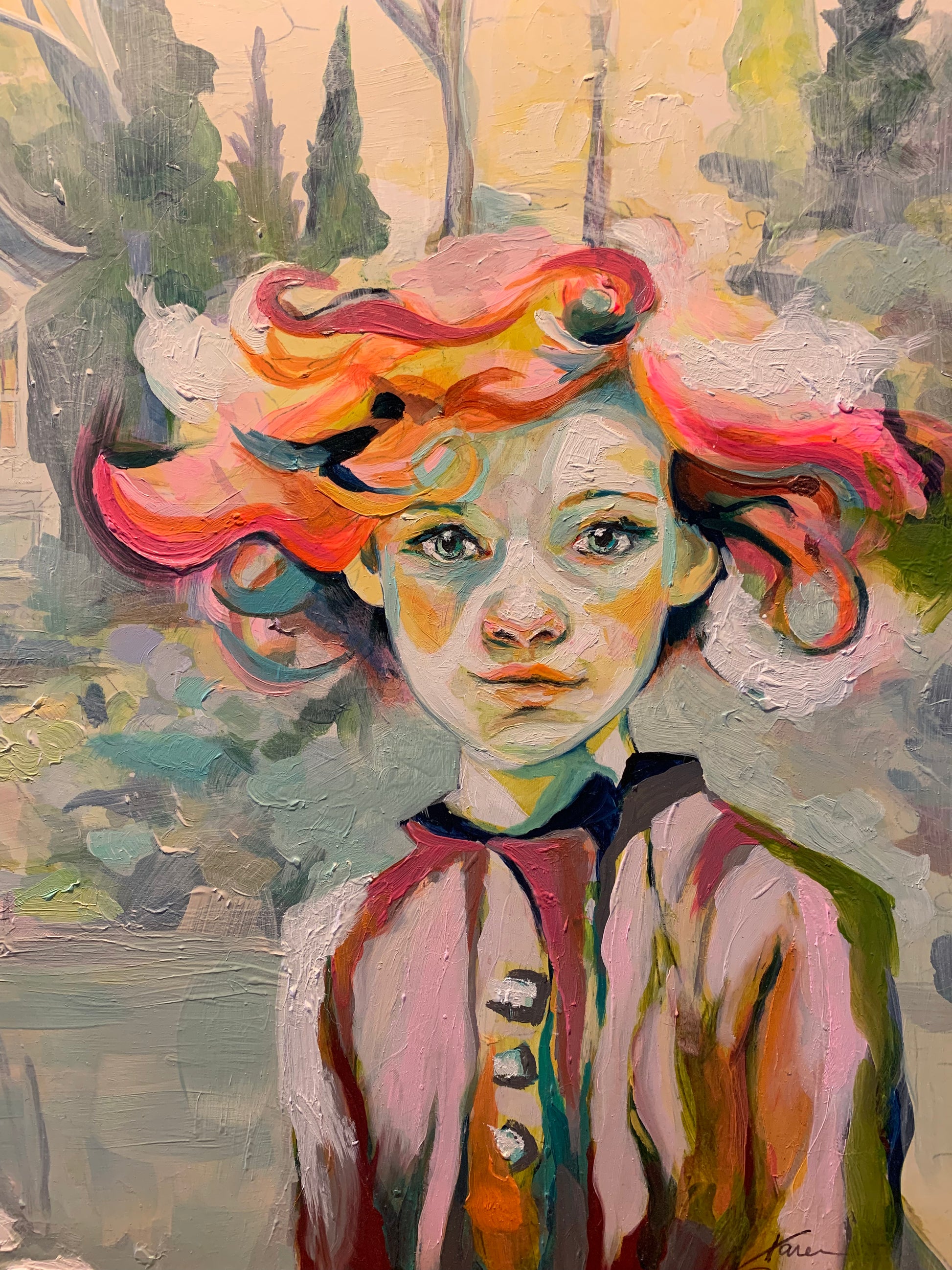 This captivating oil painting invites you into a world where the past and present blend seamlessly. A young figure, with vibrant pink hair that seems to dance in the breeze, gazes out with an expression that holds both curiosity and a hint of melancholy. Behind them, an ornate, timeworn building stands amidst a garden filled with vibrant, surreal colors, as if the landscape itself is alive with memories. The pathway leading to the door invites the viewer to step into this dreamlike realm, where every detail tells a story of forgotten moments and timeless beauty. This piece captures the delicate balance between nostalgia and the enchanting mysteries that lie just beyond the threshold.
