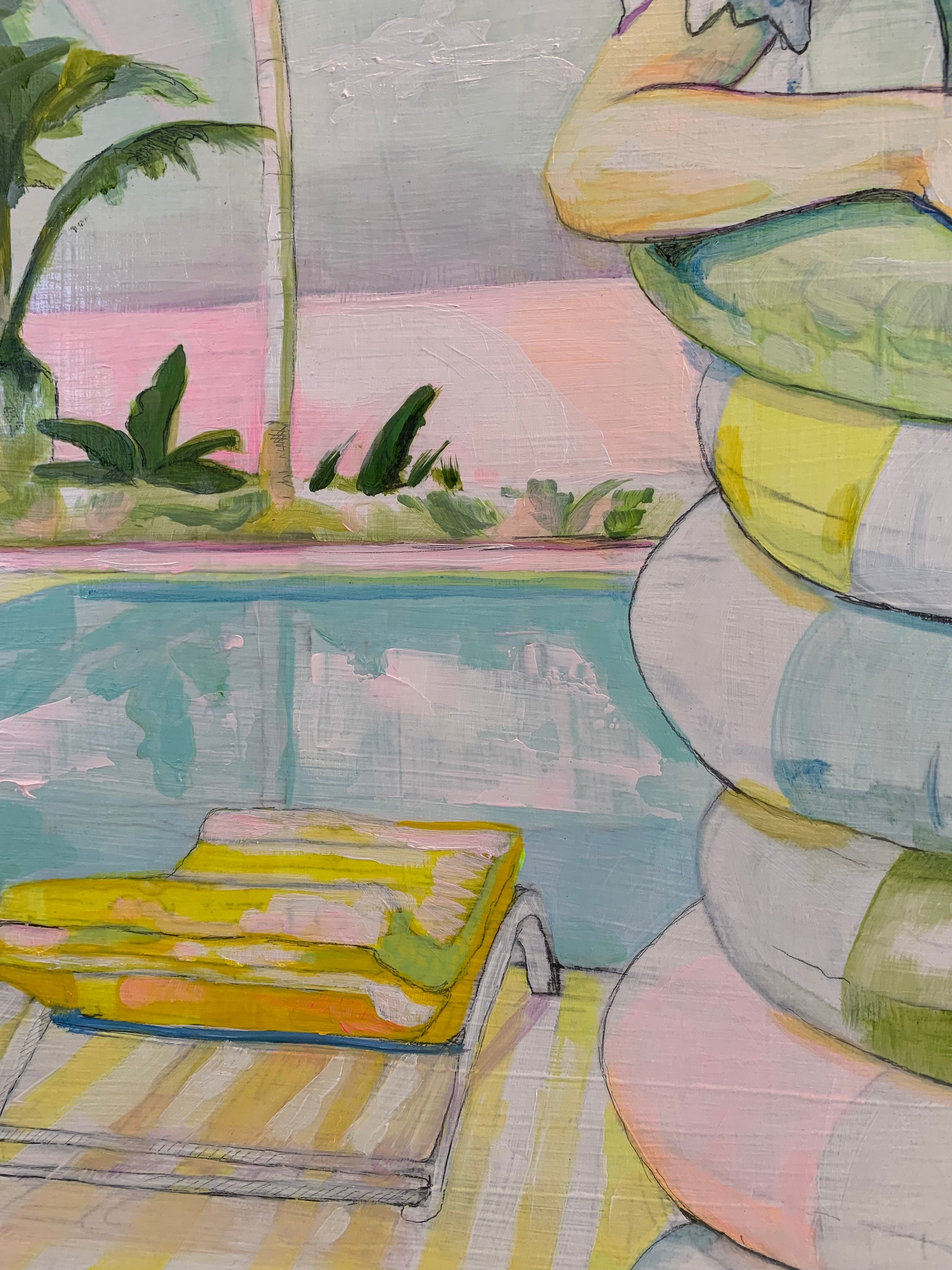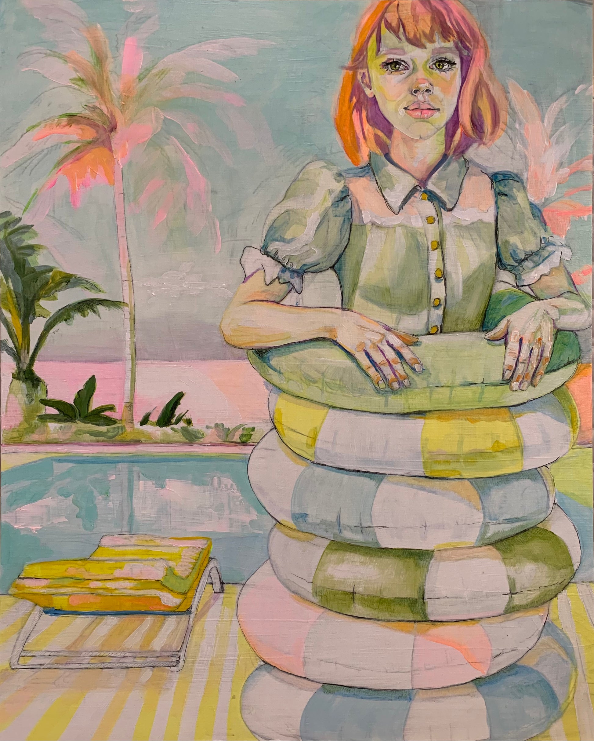 She stands encircled by soft, pastel rings—floatation devices or emotional buffers, it’s hard to tell. Her gaze is direct, but her body is layered in protection, as if safety must be stacked to be believed. Set against a dreamlike poolside scene, this portrait explores the invisible armor we try to build around ourselves—especially when change is near.