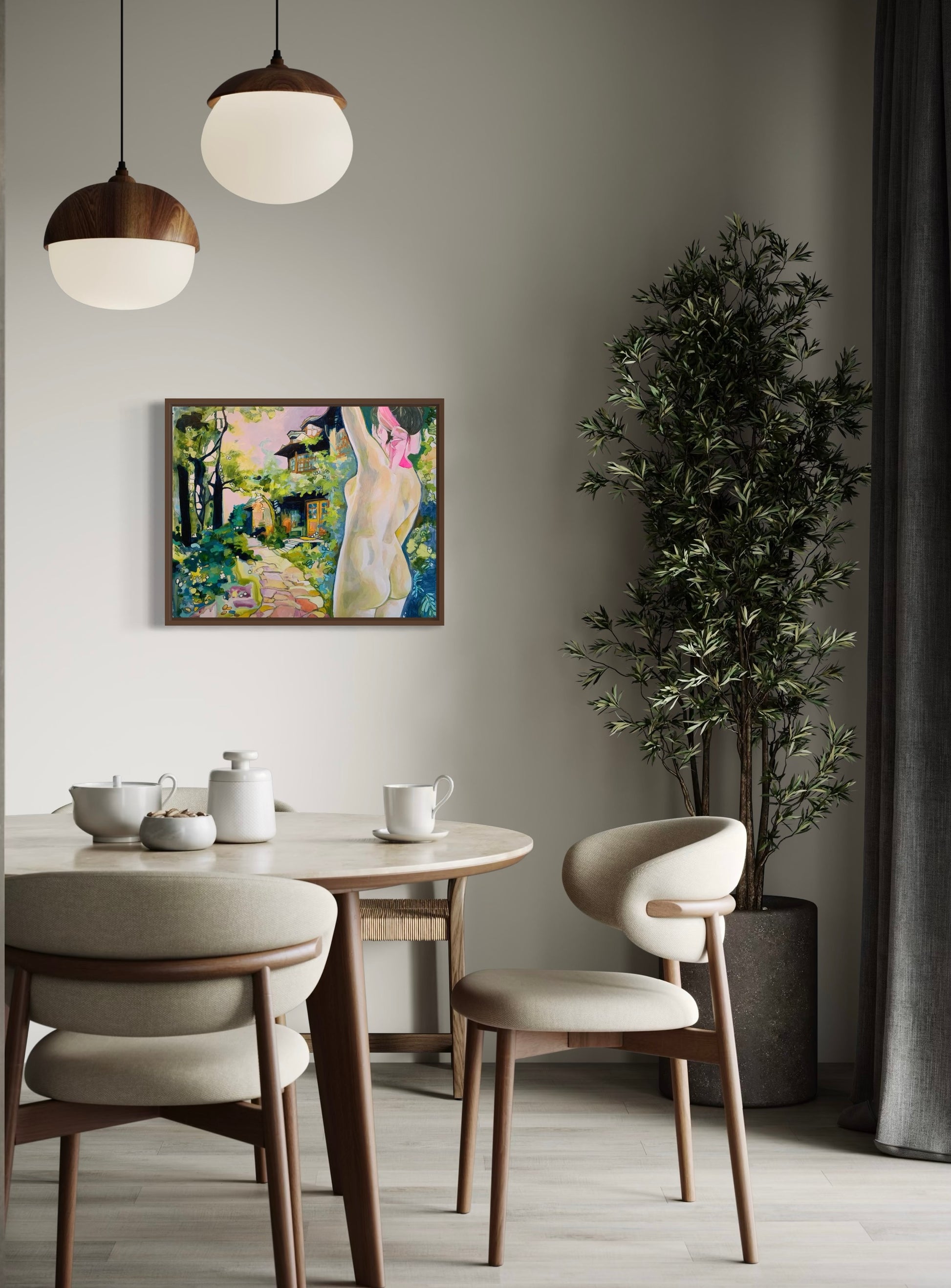 In this vibrant and dreamy scene, a figure stands in graceful solitude, facing an inviting, verdant pathway that leads to a charming, rustic cottage. The interplay of light and shadow creates a sense of warmth and serenity as lush greenery envelops the scene, while soft pastels in the sky hint at the quiet beauty of dusk or dawn. The figure, wrapped in a pink headscarf, embodies a moment of self-reflection and connection with nature, as if embracing the peaceful energy surrounding them. This painting celebrates the beauty of stillness, inviting viewers to step into a world of calm and introspection.