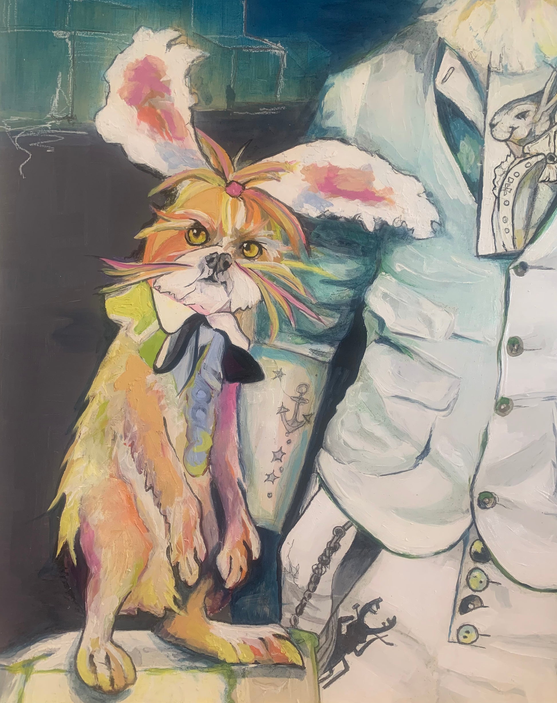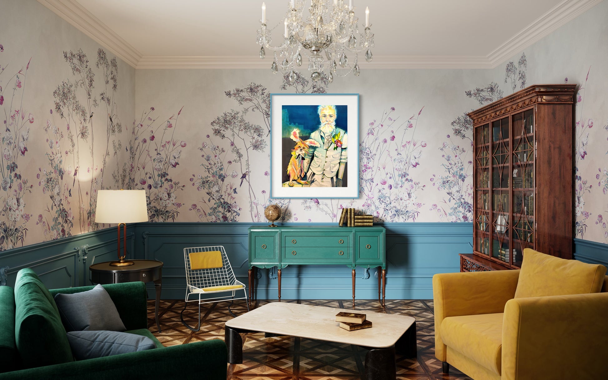 Discover the enchanting world of "Whimsical Companions" by Karen Ann Jones, where surrealism and vibrant colors bring to life a unique duo that embodies individuality and imaginative storytelling. This captivating oil painting features a distinguished gentleman and his fantastical pet, both adorned with intricate details and expressive features that celebrate the spirit of self-empowerment and personal journeys.*